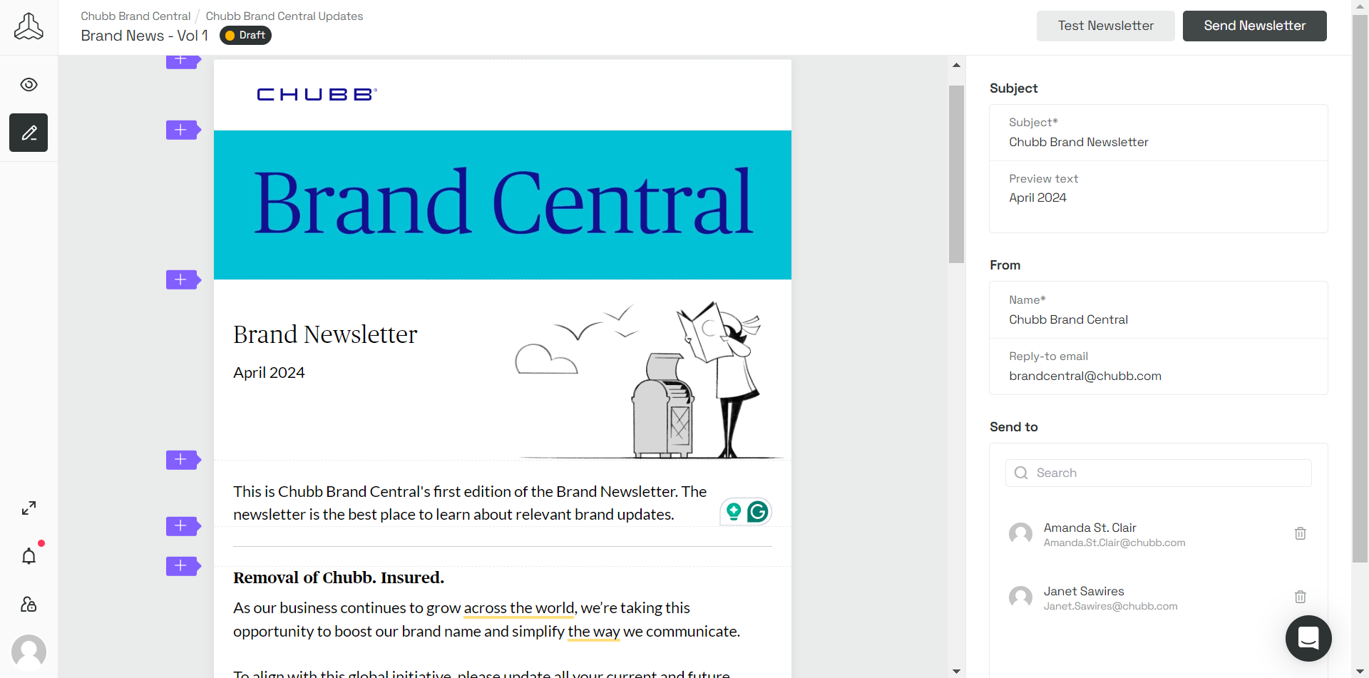 In 2022, we began building the tool and named it Chubb Brand Central. We first tested the environment with our EMEA marketing team. I conducted a series of tests for their teams to perform within our beta environment, and with their feedback, we were able to launch to the rest of the regional marketing teams after two weeks of testing.